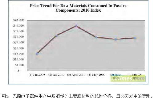 在7月份,無源電子器件在生產(chǎn)過程中所消耗原材料的帕曼指數(shù)(Paumanok index)增長了4%。這標(biāo)志著,在2010年4月急劇上漲之后的原材料價格整體下降的局面已經(jīng)臨近結(jié)束(圖1)。