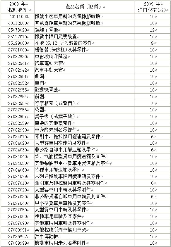 - 兩岸經濟合作架構協議於6月29日第五次「江陳會」正式簽署完成,汽車零組件納入早期收獲清單,主要為輪胎、車身零件、傳動件,另包括鋰離子電池等。