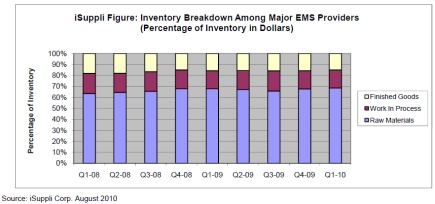 iSuppli指出,觀察全球前五大電子制造服務(EMS)的最新庫存狀況顯示,在2010年第一季,零組件與原材料占據近七成的總庫存量;相對來看,在制品(work-in-process goods)占據總庫存量的比例為17%,成品(finished goods)所占比例則低于15%。