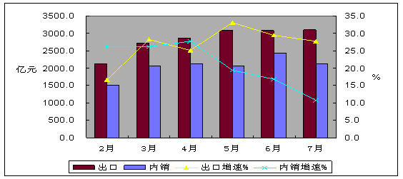 五、內(nèi)外銷(xiāo)增速差距拉大,出口依存度繼續(xù)提高。今年以來(lái),隨著外需不斷回暖,外銷(xiāo)出現(xiàn)持續(xù)增長(zhǎng),到7月底,外銷(xiāo)增速已經(jīng)連續(xù)5個(gè)月超過(guò)30%,并超過(guò)內(nèi)銷(xiāo)增速6.5個(gè)百分點(diǎn)。其中,內(nèi)銷(xiāo)產(chǎn)值14086億元,同比增長(zhǎng)23.9%,比上半年回落3.3個(gè)百分點(diǎn),低于產(chǎn)業(yè)平均增速3.7個(gè)百分點(diǎn);出口交貨值19752億元,同比增長(zhǎng)30.4%,高于產(chǎn)業(yè)平均增速2.8個(gè)百分點(diǎn)。產(chǎn)業(yè)出口依存度(58.4%)比去年同期提高1.3個(gè)百分點(diǎn),比上半年提高0.3個(gè)百分點(diǎn)。