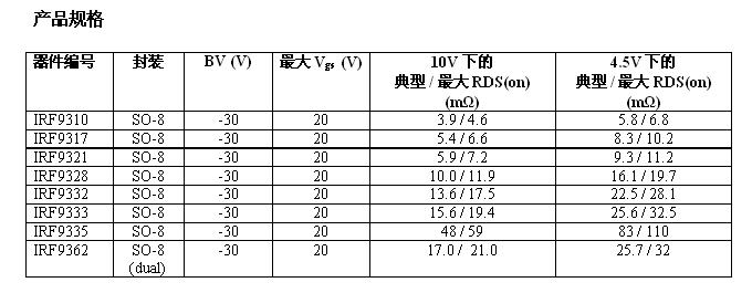 IR 亞太區銷售副總裁潘大偉表示:“相比上一代產品,這個新型SO-8 P 溝道 MOSFET系列顯著改善了電流處理能力,更為客戶提供廣泛的導通電阻選擇,以適應他們對溫度和成本的要求。同時,P 溝道技術也可以簡化電路設計。”