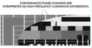 如果沒有發(fā)生亮度-色度分離,載波正循環(huán)或反循環(huán)時,顏色信息使畫面更亮或更暗。同時顏色信息也會錯誤地出現在圖像的黑白部分(圖2)。