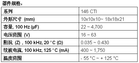 新款146 CTI電容器具有最苛刻的回流焊曲線,提供從10mmx10mmx10mm至更大的18mmx18mmx21mm的8種外形尺寸。今天發(fā)布的器件的高溫性能達(dá)+125℃,在100kHz和+20℃條件下的阻抗為0.035Ω~0.430Ω,在100kHz和+125℃條件下的紋波電流為400mA~1750mA,在+125℃下的使用壽命長達(dá)6000小時(shí)。