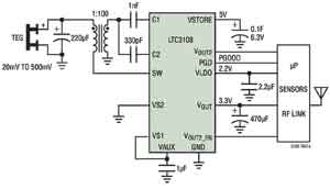 迄今為止,高集成度DC/DC升壓型轉換器一直比較缺少,這類轉換器可以收集和管理由極低的輸入電壓源提供的多余能量。不過,LTC3108極大地簡化了收集和管理由極低輸入電壓源提供的多余能量的任務。其升壓型拓撲在輸入電壓低至20mV時仍能正常運行。這具有重大意義,因為它允許LTC3108從低至1℃的溫度變化中收集TEG提供的能量。