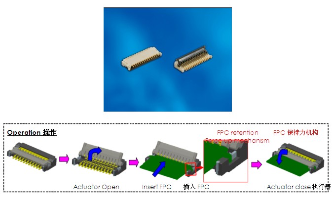 FCI提供的0.5毫米間距, 0.7毫米高度FPC 零插入力連接器可在高度極低的空間內提供可靠的連接。它是原SVL系列(0.5毫米間距和0.9毫米高度 ZIF)的升級版,而SVL系列已經被廣泛地認為是零插入力連接器的標準,用于顯示背光燈和可觸摸屏式連接。該VLP0.7毫米高度系列具有相同的帶電纜鎖定功能及底部連接型式的后向觸發執行器。