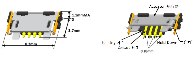 該連接器為0.2毫米(錯位排列)連接間距,帶有0.4毫米導向位。目前可提供11針和29針,計劃最多達81針。連接器高度為0.9+/-毫米。其外殼材料為熱塑塑料(UL 94V-0), 固定調整片和連接器的銅合金無鹵素。作為底部接觸型產品,因此可最為廣泛地適用于掀蓋式執行器,很方便進行關門操作。就連接器規格而言,連接器可通過帶有外殼開槽結構的耳式電纜分割結構提供電纜預持功能。要求的電纜厚度是:0.2毫米+/-0.03