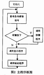 主程序的主要功能是循環(huán)調(diào)用顯示子程序、按鍵子程序,查詢各輸入信號狀態(tài),根據(jù)按鍵設定的各種參數(shù)和各輸入信號狀態(tài)控制各執(zhí)行機構(gòu),完成對PCB周轉(zhuǎn)箱托架系統(tǒng)的傳動控制,以及對PCB板的有序傳送,判別系統(tǒng)運行狀態(tài)是否異常,并及時報警或解除報警。主程序框圖如圖2所示。