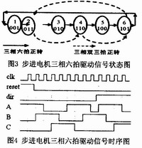 驅(qū)動子程序主要負責生成步進電機驅(qū)動器所需要的信號。當上行鍵或下行鍵按下,或者根據(jù)主程序運行結(jié)果,需要提升或降落周轉(zhuǎn)箱托架,主程序會調(diào)用步進電機驅(qū)動子程序。步進電機采用三相六拍工作方式,根據(jù)絲杠付螺紋間距,計算出步進電機每步進程,再根據(jù)周轉(zhuǎn)箱板間距,確定不同工況下,步進電機的正/反轉(zhuǎn)步數(shù),這些步數(shù)保存在各相應存貯器里,供主程序調(diào)用驅(qū)動子程序時使用。圖3和圖4分別為步進電機三相六拍工作方式時驅(qū)動信號的狀態(tài)圖和時序圖。