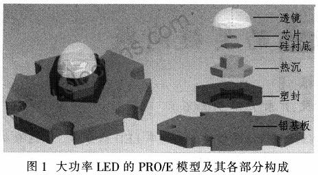 討論在現有結構、LED封裝及熱沉材料熱導率等因素變化對于其最大功率的影響,尋找影響LED散熱的關鍵因素。研究方法為有限元熱分析法.該方法已有實驗驗證了LED有限元模型與其真實器件之間的差別,證明其在誤差許可范圍內是準確可行的。