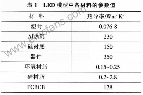 LED輸入功率為1W,光效率取10%;封裝體外部的各組件(包括MCPCB、陶瓷封裝、熱沉的外部)通過與空氣的對流散熱;器件與外界的熱對流系數為20。工作環境溫度為25℃;器件滿足使用ANSYS軟件進行穩態有限元熱分析的條件;最大結溫選擇為125℃。各種材料的參數如表1所示。