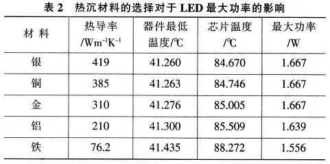 表2給出透鏡熱導率為0.2Wm-1K-1時,不同熱沉材料的導熱系數對于LED最大功率影響。由表2看出,熱沉材料對于LED的最大散熱能力的影響很小。[page]