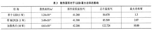 表3為3種不同散熱方式對LED的溫度分布、最大功率的影響??梢钥闯?,增加散熱面積是很好的散熱方式,可以輕易地提高LED器件散熱能力,這是目前LED產品所普遍使用的散熱方式之一。然而缺點也很明顯:影響成本、增加產品重量、影響封裝密度。無限度地提高LED散熱片面積顯然不現實,因此一般使用1.5inch2散熱片提升LED產品最大功率至10W左右,出于成本等因素就不能繼續提高。