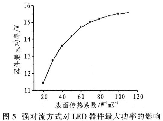 常見對流散熱方式有兩種:自然對流和強制對流。固定結構的散熱與表面傳熱系數有關??绽浞绞綍r,不同傳熱系數對最大功率的影響如圖5所示。強對流方式在一定速度內會大大提高LED產品的散熱能力,有助于提高散熱效果。