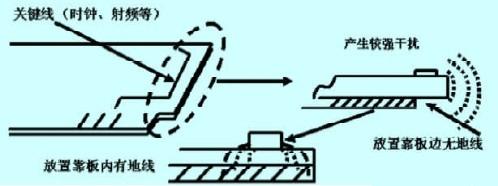印制電路板的板邊處理是否合理, 決定著是否能夠更加有效地抑制信號的對外干擾。為防止高速數字電路通過板邊對外干擾, 應該嚴格控制其布線位置, 讓其盡量靠近印制板內部。高頻等干擾較強信號線不應該走到板的邊緣, 以防止無對應地層耦合回路, 產生信號對外的干擾泄漏, 如圖3 所示: