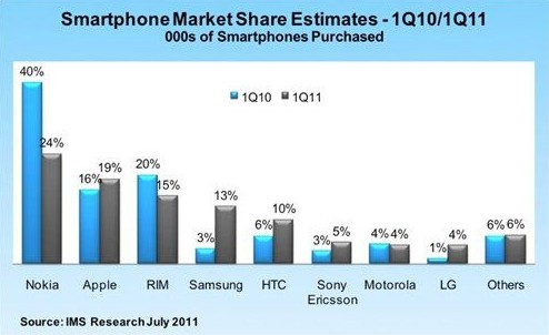 市場研究公司IMS Research表示,在傳統(tǒng)手機市場,三星近年來的表現(xiàn)最為突出。該公司擁有多元化的產(chǎn)品組合,包括使用其自身操作系統(tǒng)bada以及Android和 Windows Mobile操作系統(tǒng)的產(chǎn)品,也包括廣受歡迎的Galaxy系列產(chǎn)品。該公司在智能手機市場的份額從2010年第一季度的3%左右一舉升至2011年第一 季度的13%以上。與此同時,HTC等智能手機廠商的市場份額也大幅上升。