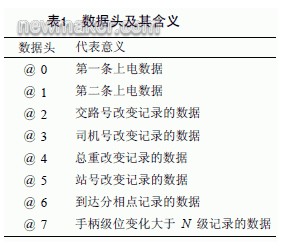 該裝置采用了大容量的存儲器。由于機車運行的數(shù)據(jù)較多,為了降低GPRS 的使用成本,對于所有采集的信息均采用非分區(qū)定長壓縮方法[2]存儲,每包數(shù)據(jù)定長35 個字節(jié),由數(shù)據(jù)頭、公共數(shù)據(jù)、數(shù)據(jù)幀標識、數(shù)據(jù)校驗位等4 部分組成。數(shù)據(jù)頭占一個字節(jié),公共數(shù)據(jù)占32 個字節(jié),數(shù)據(jù)幀標識和校驗結果各占一個字節(jié)。由于每包數(shù)據(jù)只有35 個字節(jié),不能包含所有的機車運行信息,因此在上電的時候?qū)⑼暾囊粭l機車運行信息拆分成兩包發(fā)送。另外,@7 代表的級位變化大小N 的值可以在程序中設定。數(shù)據(jù)頭及其具體含義如表1 所示。