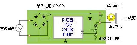 羅姆為了適應上述市場需求而在進行LED照明用驅動器IC的開發。為使LED保持一定的亮度點燈,需要有進行恒流控制的LED驅動器IC。通常,是從交流電源開始進行恒流控制,所以使用降壓型開關穩壓器方式(圖1)。
