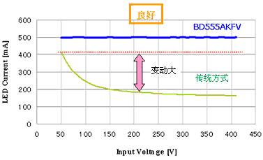 傳統方式中,輸入電壓變動和輸出電壓變動大,須根據應用條件重新設計電源模塊。如果輸入電壓變動大,則交流電壓頻率(全波整流后為100Hz~120Hz)中帶紋波的輸入電壓會使得LED的亮度發生閃爍。為了穩定輸入電壓,必須在設計電源模塊時采取措施。如果輸出電壓變動大,就必須針對每一個光源的輸出電壓(LED的燈數)變更外接元器件的常數,設計出許多種電源模塊來,從而增加了設計工作量(圖2)。