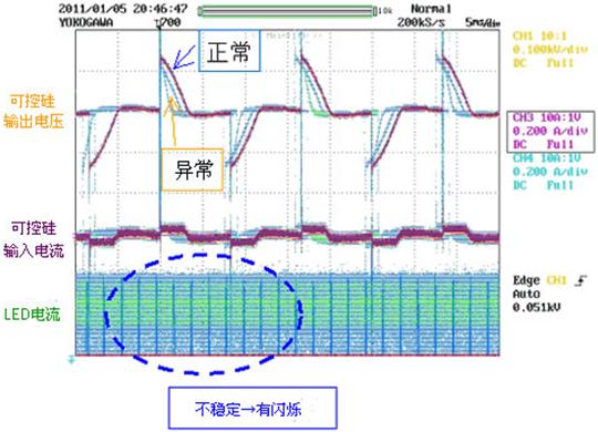 可控硅調光器在可控硅處于導通狀態時必須使保持電流持續流通;一旦保持電流下降,可控硅便關斷了。由于LED照明燈與原有照明燈相比,功耗極低,所以使可控硅的保持電流下降,調光器就往往會因此而不定期關斷從而發生閃變(閃爍)現象。(圖5)