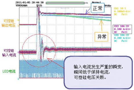 但是,即使裝載了確保保持電流恒定的泄放電路,還是有不能防止可控硅調光器引發誤動作的情況出現。其原因是因為可控硅接通時使輸入電容充電的沖擊電流會造成大的瞬變,保持電流瞬間下降從而造成可控硅關斷(圖6)。