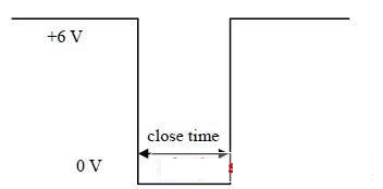 采用可控制開關的辦法難于完成測量,需采用其他辦法進行繼電器觸點通斷過程的模擬。首先對繼電器觸點處電壓波形進行分析,由于瞬時通斷測量儀接入抖閉觸點的電壓為6 V,通過抖斷觸點的電流為10 mA,當繼電器觸點出現抖閉現象時電壓波形應如圖3 所示(抖閉觸點在正常狀態時所加的+6 V 電壓在抖閉狀態時被直接短路,電位被鉗制在0 V),形成一個負跳變脈沖,其抖閉時間為脈沖寬度,而出現抖斷觸點的電壓波形如圖4 所示。