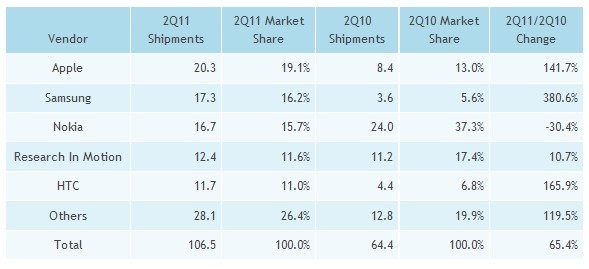 IDC最新市場(chǎng)報(bào)告指出,2011年第二季智能手機(jī)市場(chǎng)表現(xiàn)亮眼,出貨量從去年同期的6440萬(wàn)支成長(zhǎng)至1.065億支,成長(zhǎng)了65.4%。而蘋(píng)果市占率達(dá)19.1,居市場(chǎng)首位,其后分別是三星、諾基亞、RIM與HTC宏達(dá)電。