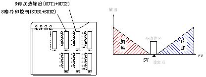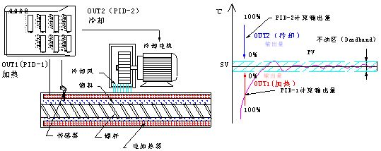 DTE10T在擴(kuò)展輸出模塊后,SUB1輸出口可定義為冷卻輸出控制。利用雙PID計(jì)算,在溫度沒(méi)有沖過(guò)設(shè)定值時(shí),溫控器就可提前啟動(dòng)冷卻風(fēng)機(jī),避免了溫度從高不下的情,并能保持溫度穩(wěn)定性。個(gè)人認(rèn)為報(bào)警驅(qū)動(dòng)的冷卻模式總將由于控溫不穩(wěn)定等原因被淘汰。雙PID控制方式必定是追求更高控溫精度的首選。如圖5所示。