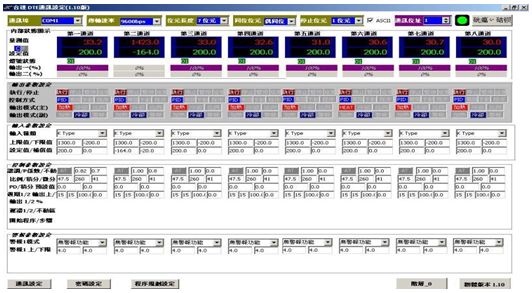 DTE對(duì)于參數(shù)的設(shè)置完全可以采用DTE專(zhuān)用的PC軟件來(lái)完成,全中文的DTE設(shè)置畫(huà)面簡(jiǎn)單明了。不動(dòng)區(qū)等參數(shù)需要結(jié)合現(xiàn)場(chǎng)實(shí)際工況來(lái)分析與設(shè)定。塑料擠出機(jī)一般可設(shè)置在:0.~2之間,而PID參數(shù)可以借助AT自動(dòng)完成。