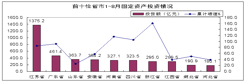 前8個(gè)月,東部地區(qū)完成投資3558億元,同比增長75.9%,增速高于去年同期33.6個(gè)百分點(diǎn);江蘇、廣東、浙江、北京投資上升較快,增速超過80%,特別是江蘇省完成投資1375億元,占全國總投資的四分之一。中部地區(qū)完成投資1472億元,同比增長58.4%,其中河南投資增長較快,增速均超100%。西部地區(qū)投資慢于中東部,完成投資572億元,同比增長47.2%,其中四川省投資323.5億元,占西部地區(qū)的57%,同比增長105%。