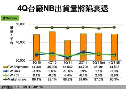 2011年第三季返校商機未顯現,已為後續筆記型(NB)市場買氣不振留下伏筆,DIGITIMES Research 資深分析師兼主任簡佩萍預估,第四季臺廠 NB 出貨量將再度陷入較上季衰退局勢,幅度為1.3%。全球NB市場則將衰退更多,為4.8%,單季市場規模恐再度未能達到5,000萬臺水準,僅及4,939.7萬臺。