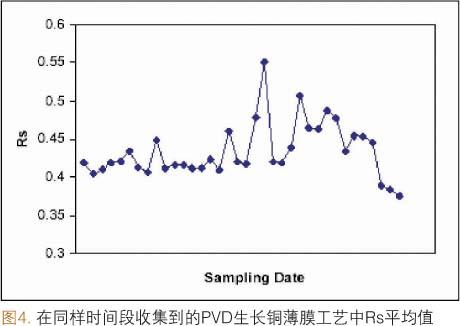 這種設備最初的一種應用是監測一系列物理氣相淀積(PVD)的反應腔,這些反應腔在銅互連金屬化制程中被用來淀積TaN/Ta/Cu襯墊層和籽晶層。這種監測作為標準的平面電阻,膜厚量測的補充而存在。薄膜堆棧中Ta和Cu成分的織構強度和譜線展寬數據都需要收集。TaN層具有無定形結構,因此無法監測。圖3說明了一個從銅元素峰寬控制圖表中輸出的例子。數據的趨勢穩步向上,表明PVD銅籽晶的平均晶粒大小隨著時間在減小。圖4說明了在相應的Rs圖表中類似但并不十分顯著的增加。隨后的設備診斷發現受影響的反應腔一個閥門有空氣泄漏的現象。泄漏影響到濺射工藝,進而影響銅籽晶層的淀積,這一過程極有可能是在淀積和淀積之后的自退火過程中,由于銅在Ta表面的遷移率下降造成。更換了閥門之后,Rs和銅元素峰寬的值都變小,我們從圖3和圖4控制圖表中的最后三個數據點可以看出。