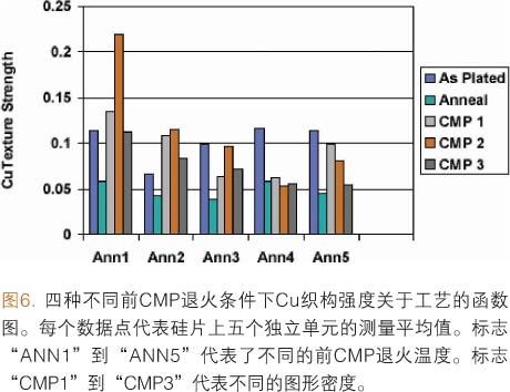硅片在制程中的三個不同步驟進行測量:電鍍之后,前CMP退火之后,金屬化之后。圖6說明了在M1測得的銅織構強度的結果。我們將最終結果作了平均,因為沒有觀察到銅微結構在硅片中央和邊緣有任何不同。從數據中可以看出很多趨勢,但應該強調的是,微結構的數據可以與其他線上量測的結果直接聯系起來,特別是硅片的良率。所有的結果綜合起來,可以選擇出該技術節點比較優化的前CMP退火條件。