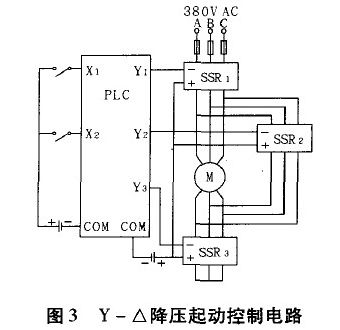 圖3為PLC控制的Y-△降壓起動控制電路,其中X1、X2分別表示PLC的輸入,控制電動機的起停;Y1、Y2、Y3表示PLC的輸出。當Y1和Y3有效時,對應的SSR1和SSR3也同時有效,此時電動機為Y型接法,延時幾秒后,Y3失效,Y2有效,則對應的SSR3三相輸出端斷開,SSR2三相輸出端合上,則電動機變?yōu)椤鹘臃ǎ瓿闪薡一△降壓起動。