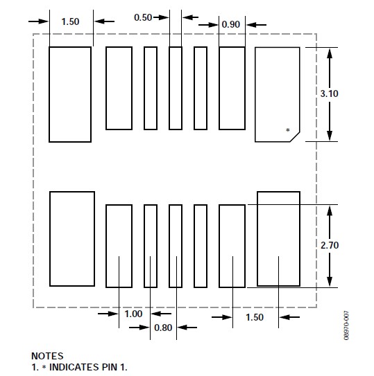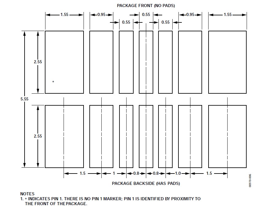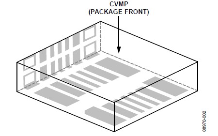 關(guān)于垂直和水平安裝方向的CVMP焊盤布局(焊盤圖形),請參閱本應(yīng)用筆記的"焊盤布局"部分。CVMP背面的焊盤布局如圖7所示。注意,封裝正面上有一些額外的焊盤(見圖4)沒有顯示在焊盤布局中,這些焊盤用作測試點,不應(yīng)進行電氣連接。