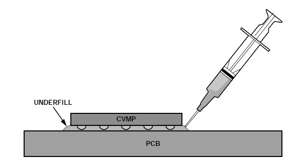 焊接完成后,由于焊料厚度有限,封裝與PCB之間會有一個較窄的空間。已經(jīng)證明,用底部填充材料填充此空間可以改善焊接抗疲勞壽命,因為它能減輕這種封裝(引腳為嵌入式,不能用來釋放應(yīng)力)中焊點應(yīng)力的影響。