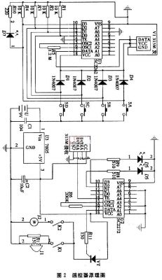 手持遙控器原理如圖2所示。電路由發射和接收報警電路組成,發射電路由發射模塊V1、編碼芯片U1組成。U1即SC2262的1-8腳為三態地址編碼,這里我們將SC2262的7腳接地,同樣車載報警裝置的接收電路的解碼芯片SC2262也設置成7腳接地,否則不能解碼;接收電路由接收模塊V2和解碼芯片U2即SC2272組成,這里我們將SC2272的1-8腳三態地址編碼設置為1、2、7腳接地。對應的車載報警裝置的發射電路也將三態地址編碼設為l、2、7腳接地。報警電路由震動器J2,蜂嗚器兒和D5、D6兩個不同顏色的LED組成。電源分別有9 V和5 V。將9 V直接供給發射電路,再將9 V經7805降到5 V供給接收電路和報警電路。