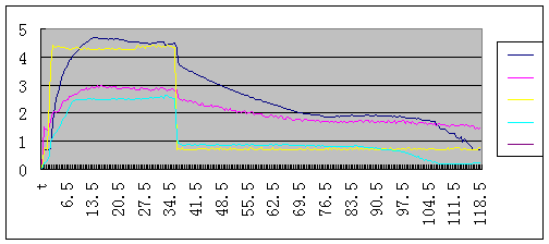 注:深藍—輸入軸轉速,黃—節氣門開度,紫紅—發動機轉速,淺藍—電磁離合器電流