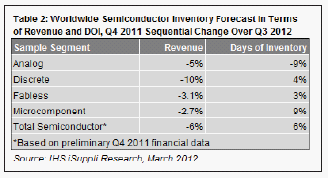據(jù)IHS iSuppli公司的庫(kù)存研究報(bào)告,對(duì)于半導(dǎo)體的需求下降,在2011年第四季度加劇了半導(dǎo)體產(chǎn)業(yè)庫(kù)存過(guò)剩局面,并帶來(lái)一系列令人不快的變化,但在看到新的樂(lè)觀跡象之后,半導(dǎo)體廠商急于忘掉不快,希望這是低迷階段的尾聲。