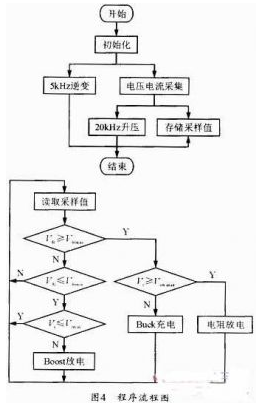按照上述控制策略,得到如圖4的程序流程圖,其中5kHz逆變?yōu)榫鶋弘娐分械哪孀兤?,采?0%的PWM脈沖波來實(shí)現(xiàn),不需要復(fù)雜的控制算法。20kHz升壓模塊完成開關(guān)管S1信號(hào)的產(chǎn)生。需要通過電壓采集電路,得到串聯(lián)電容的總電壓。4個(gè)判斷模塊通過判斷Vdc和Vc的電壓范圍決定對(duì)電容的充放電控制。