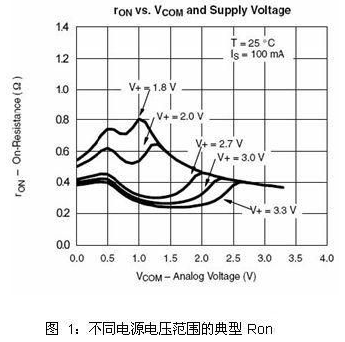 低導通電阻往往是模擬開關在音頻切換時的主要選擇因素。值得注意的是,導通電阻是針對具體的VCC、VIN(電壓輸入)及給定負載電流而指定的。在晶體管級,RON為器件長度(L)、器件寬度(W)、電子與空穴遷移率、氧化層電容、門限電壓及信號電壓的函數。