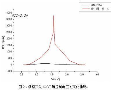 圖2中可以看出采用該改善技術的英聯UM3157模擬開關產品與普通同系列模擬開關產品在ICCT上的顯著區別。