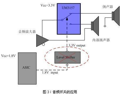 此外,英聯的低ICCT系列模擬開關具有更低的VIH電平值,可以使用較低的控制電平實現開關的高電平切換控制。產品的這種特性大大減少了系統工程師設計電路的復雜性,特別是在供電電源和控制信號電平不匹配的便攜產品應用中可以免除使用電平轉換模塊,從而有效降低了成本。以模擬開關用來切換音頻信號為例,如圖3所示,可以使用ASIC傳輸過來的1.8V電壓直接來控制UM3157的控制管腳,而不必采用電平轉移器也能在實現開關切換的同時達到很小的漏電流。此外,由于低ICCT模擬開關不消耗很多功耗(大約1uA),且開關的導通電阻隨工作電壓的增加而降低,設計人員可以使用較高的供電電壓來達到更低的導通電阻。對于典型的音頻開關或USB應用,低的導通電阻是非常重要的。