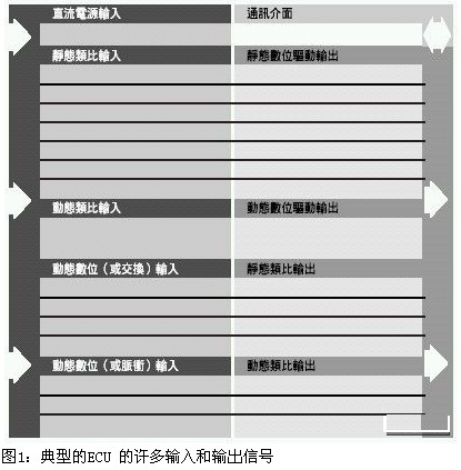 ECU 利用許多信號來監控汽車及其環境,進而管理與控制引擎和輔助設備,以達到最佳的運作狀態。圖1摘要了典型的ECU 的許多輸入和輸出信號。