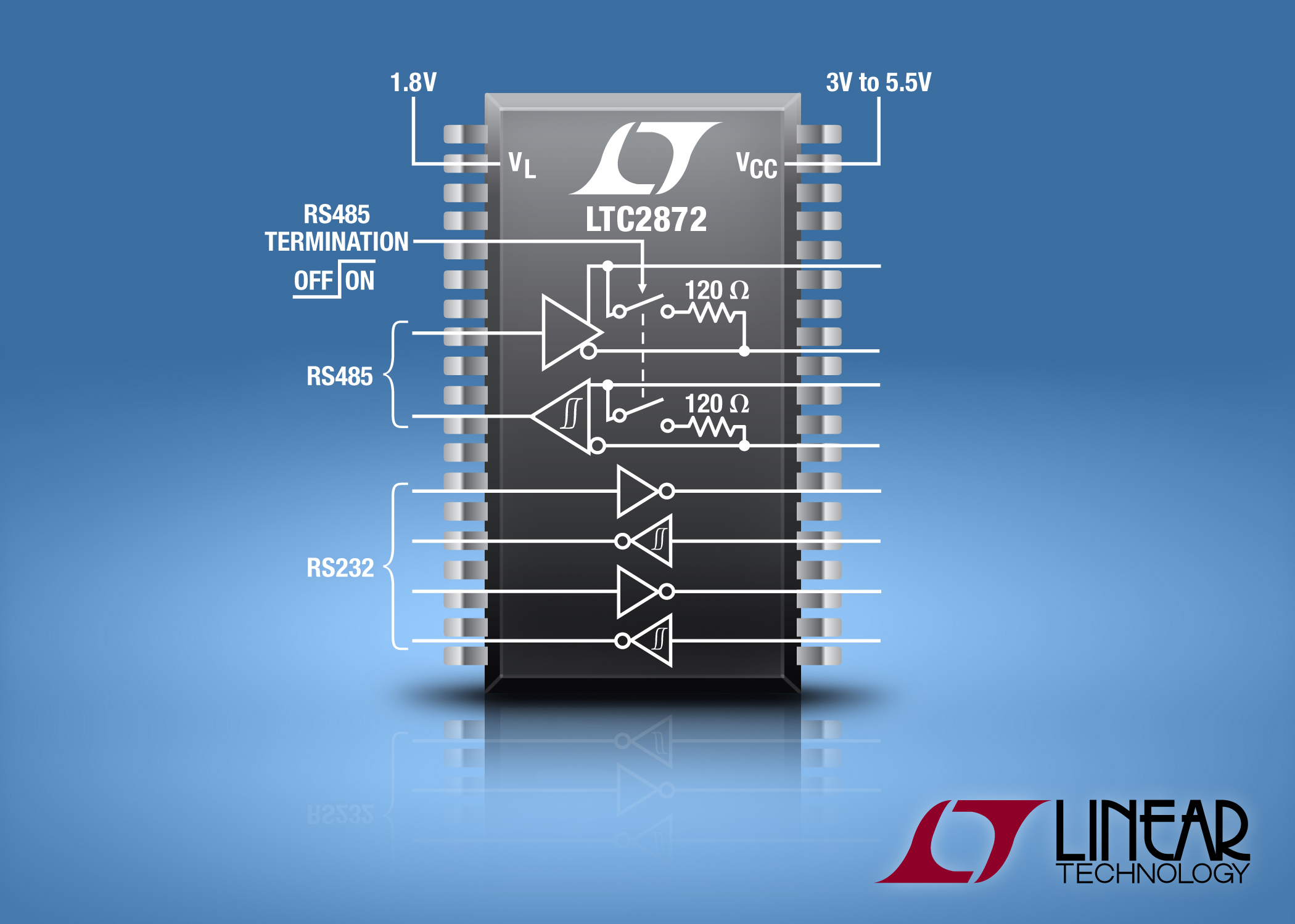 凌力爾特公司 (Linear Technology Corporation) 推出適用于 3.3V 和 5V 系統(tǒng)并具可通斷集成型終端的多協(xié)議收發(fā)器 LTC2872。RS485 系統(tǒng)需要在通信總線的末端上布設(shè)一個終端電阻器,以最大限度地減少信號反射。LTC2872 集成了引腳控制型終端電阻器以簡化接口重新配置,從而免除了外部電阻器和控制繼電器。終端電阻器在啟用時可自動接通或斷開,以與收發(fā)器所選擇的協(xié)議 (RS232 或 RS485) 相匹配。該器件還擁有高 ESD 防護能力:在收發(fā)器總線引腳上可達 ±16kV HBM (在斷電或運作時)。LTC2872 可配置為采用共用 I/O 線路的 4 個 RS232 單端收發(fā)器或 2 個 RS485 差分收發(fā)器,或者此二者的組合,從而減少了多協(xié)議網(wǎng)絡(luò)的組件數(shù)目,并提供運行中的可配置性。