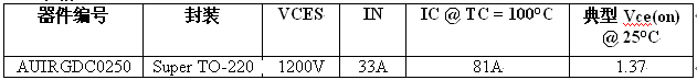 1200V AUIRGDC0250 采用緊湊的 Super TO-220 封裝,低 VCE(on) 可讓該器件降低功耗并實現更高的功率密度,正 VCE(on) 溫度系數則使其更適合并聯。此外,AUIRGDC0250 還提供經過優化的方形反向偏壓安全操作區 (RBSOA)。AUIRGDC0250 的軟開關特性使其成為幫助客戶符合系統級 EMI 規范的理想選擇。