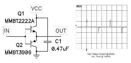 如圖2 hfe曲線所示,通常廠商都不會為這些低電流器件提供高于0.5A的電流。但是,該電路可提供大大高于0.5A的電流驅動,如圖1中的波形所示。就該波形而言,緩沖器由一個50Ω源驅動,負載為一個與1Ω電阻串聯的0.01 uF電容。該線跡顯示了1Ω電阻兩端的電壓,因此每段接線柱上的電流為2A.該數字還顯示MMBT2222A可以提供大約3A的電流,MMBT3906吸收2A的電流?! ?br />