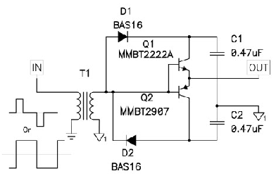 圖3顯示了一款可使您跨越隔離邊界的簡單緩沖器變量情況。一個信號電平變壓器由一個對稱雙極驅動信號來驅動。變壓器次級繞組用于生成緩沖器電力并為緩沖器提供輸入信號。二極管D1和D2對來自變壓器的電壓進行調整,而晶體管Q1和Q2則用于緩沖變壓器輸出阻抗以提供大電流脈沖,從而對連接輸出端的FET進行充電和放電。該電路效率極高且具有50%的占空比輸入(請參見圖3中較低的驅動信號),因為其將驅動FET柵極為負并可提供快速開關,從而最小化開關損耗。這非常適用于相移全橋接轉換器。