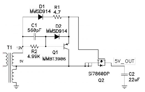 圖 4 顯示的是用于控制同步反向拓撲中 Q2 傳導的分立器件。該電路可以讓您控制開啟柵極電流并保護整流器柵極免受高反向電壓的損壞。該電路可以用變壓器輸出端的負電壓進行驅動。12V 輸入與 5V 輸出相比負電壓值很大,從而引起 Q1 傳導并短路電源 FET Q2 上的柵-源電壓,迅速將其關閉。由于基極電流流經 R2,因此在加速電容 C1 上就有了一個負電壓。在此期間,一次側 FET 將會發生傳導并在變壓器磁化電感中存儲能量。一次側 FET 關閉時,變壓器輸出電壓在正電壓范圍擺動。Q2 柵-源通過 D1 和 R1 被迅速前向偏置。C1 放電時,D2 對 Q1 基極-發射極連接進行保護。在一次側 FET 再次開啟之前,該電路會一直保持這種狀態。正如同步降壓轉換器那樣,輸出電流會真正地對輸出電容進行放電。開啟一次側 FET 會衰減變壓器二次側上的電壓并去除 Q2 的正驅動。這種轉換會導致明顯的貫通疊加一次側 FET 和 Q2 傳導次數。為了最小化該次數,當一次側和二次側 FET 均開啟時,Q1 將會盡快地短路同步整流器上的柵-源。