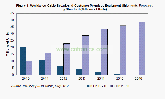 據(jù)IHS iSuppli公司的寬帶與數(shù)字家庭市場追蹤報告,2011年寬帶電纜運營商增加布署DOCSIS 3.0,使得該標準首次成為多數(shù)新寬帶有線設備的主要標準。