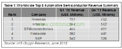 瑞薩電子的汽車半導(dǎo)體營(yíng)業(yè)收入為7.27億美元,遙遙領(lǐng)先于其它競(jìng)爭(zhēng)對(duì)手。排在其后的廠商是德國(guó)英飛凌、法國(guó)-意大利企業(yè)意法半導(dǎo)體、美國(guó)飛思卡爾半導(dǎo)體和荷蘭恩智浦半導(dǎo)體,如表1所示。